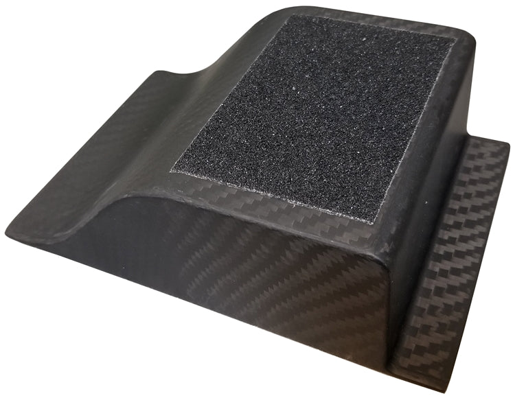 Tapered Carbon Fiber Heel Riser Is 2'' Tall x 4 1/2" Wide. Mounts under the throttle pedal for improved leverage and comfort. Heel riser has a non-skid top surface. Using a heel riser in your cockpit will keep your feet at the correct angle over the duration of the race, which will result in less fatigue in your legs and calves.